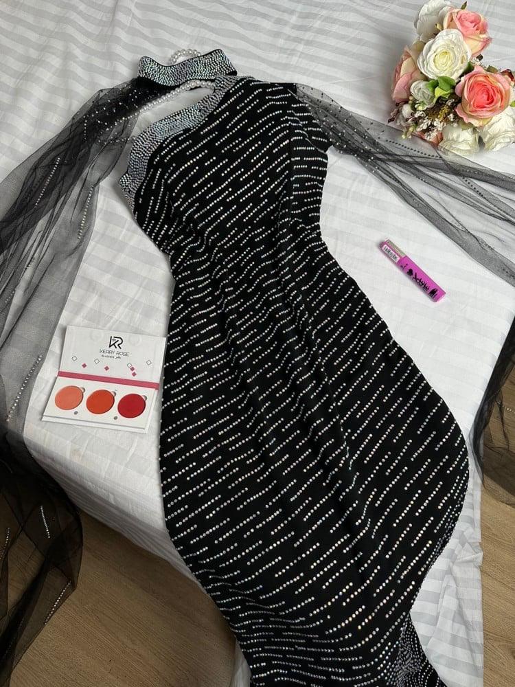 القماش🧵🪡: كريب استرتش راقي + مرصع فصوص كرستال لمعه + تل كم مع خناق