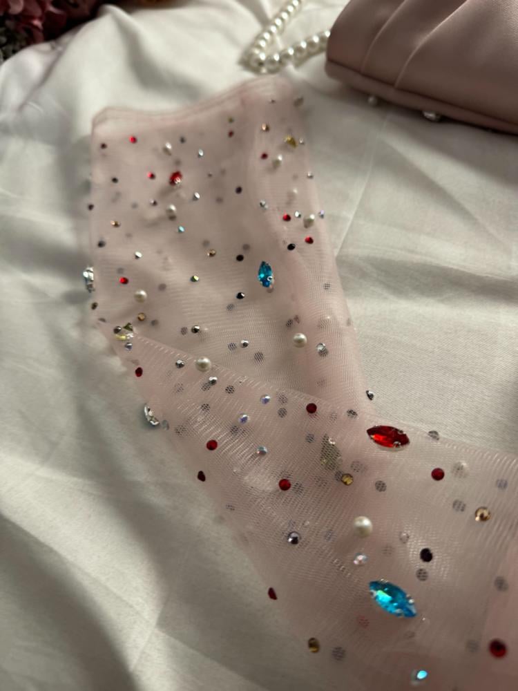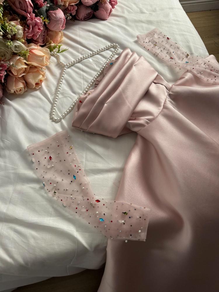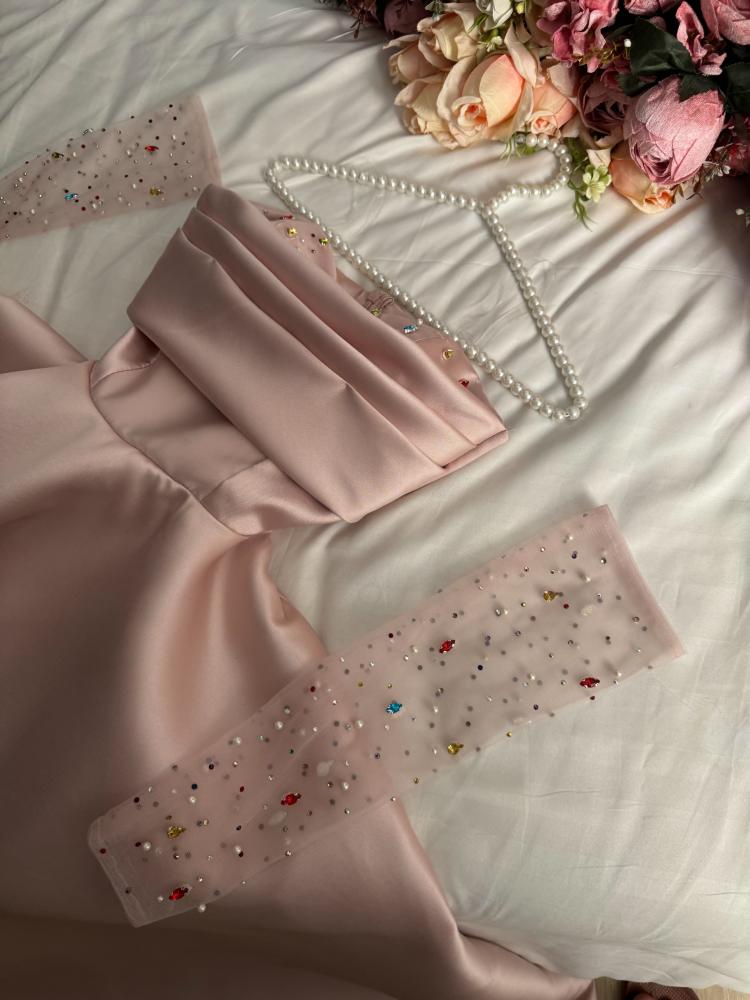 القماش 🧵 : ميكادو راقي ساده الاصلي +جيبون سهرات سلك + كم وظهر وصدر فصوص مع كرستال اصلي ملون