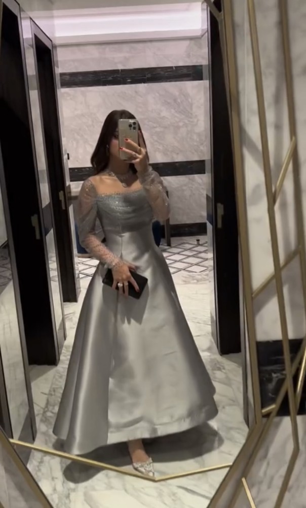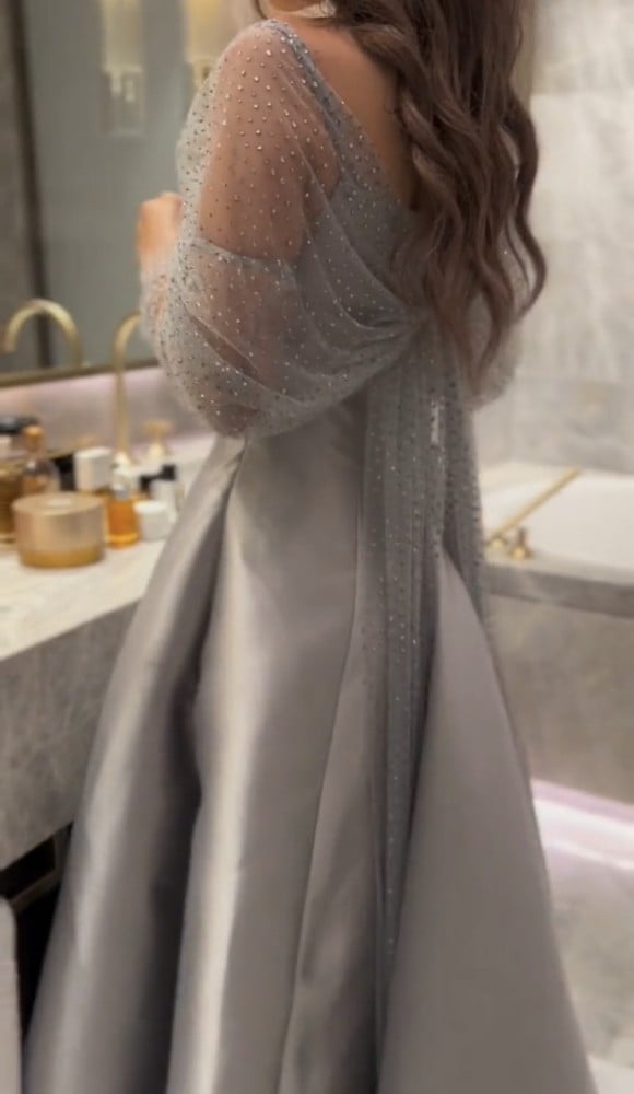 القماش 🧵 : ميكادو راقي الاصلي واقف + تل مرصع فصوص كرستال الكم وشال خلف الظهر